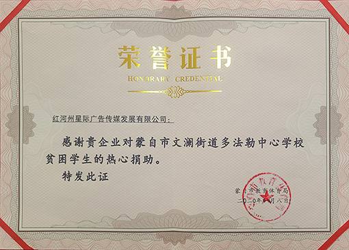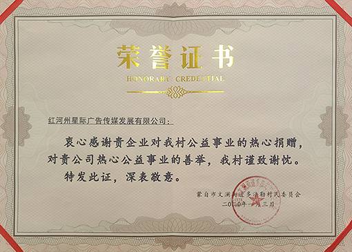 红河州星际广告传媒发展有限公司成立于2014年,是一家专业从事户外媒体广告、社区媒体广告,互联网广告等的综合型广告传媒公司。公司在红河州13县市内拥有优质社区媒体资源13000余块,社区道闸广告300余块,拥有户外媒体100余块。公司在发展业务、创造经济效益的同时,始终不忘企业社会责任建设。2016年-2020年,公司调动价值百万以上的媒体资源,对社会主义核心价值观,创建蒙自文明城市进行了“地毯式”的传播树,为蒙自市创建文明城市及精神文明建设做出了较大的贡献;2020年,恰逢新春佳节,全民抗击“新型冠状病毒感染肺炎疫情”,公司紧急调派人手,组织精干力量,上岗奔赴现场,在社区镜框广告媒体上发布4000余条《抗击新型冠状病毒》系列公益宣传,弘扬正能量,稳定群众情绪,推动和正确引导全社会积极做好疫情防控工作。进一步增强广大市民防范意识,帮助市民科学防疫。除此之外,公司在捐资助学、脱贫攻坚方面做出了应有的贡献。